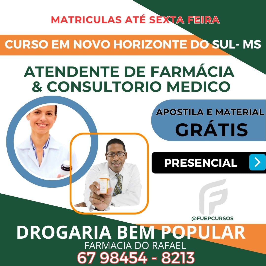 Novo Horizonte do Sul (MS) –Rafael da Farmácia está com inscrições abertas para o Curso de Atendente de Farmácia e Consultório Médico, uma oportunidade para jovens e adultos que desejam se capacitar e ampliar suas chances no mercado de trabalho.